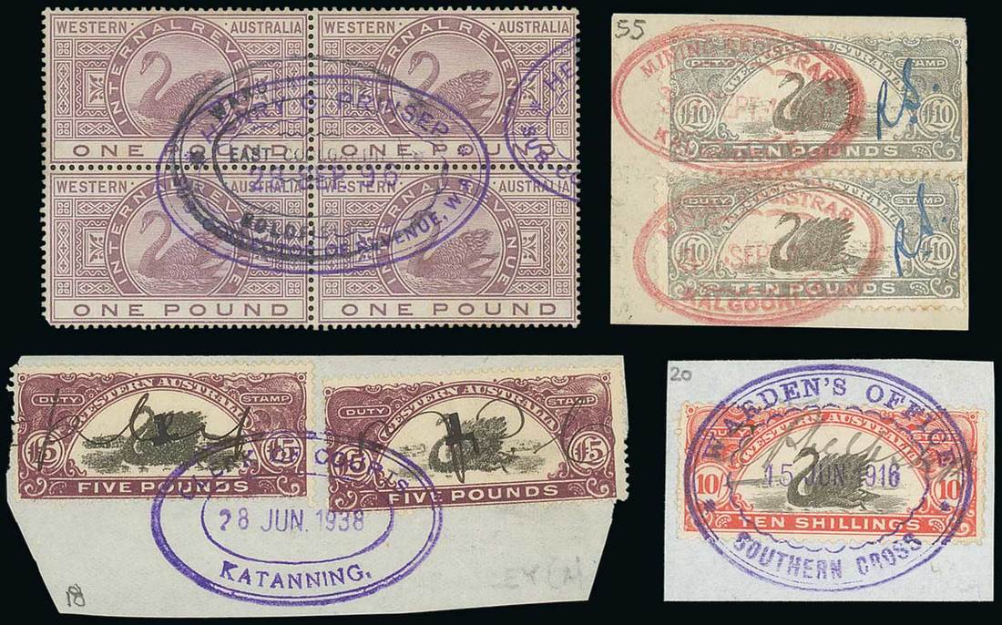Highly specialised collection on pages showing an extraordinary depth of research, the stamp arranged by office, with detailed annotations identifying each registrar authorised to cancel stamps in Western Australia stamps including some earlier Inland Revenue surcharges, though predominantly Swan type bi-colours from Waterlow and later litho printings, with high values including 30/- (11), £5 (22) and £10 (5), condition superb throughout containing loose stamps (211), and pieces (358, with 794 stamps attached including many multiples.) An outstanding collection. Photo