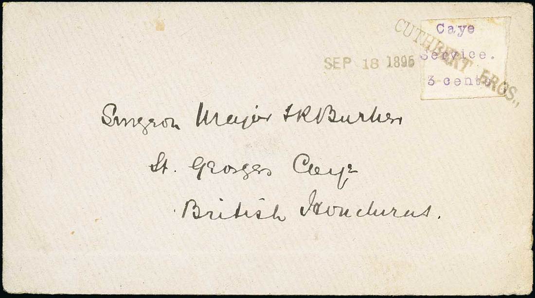 1896 (18 Sep.) envelope to St George's Caye bearing the "Caye/ Service/ 3 cents" local issue tied by "cuthbert brothers" straight line h.s. with datestamp at left, small amount of gum on face of stamp hardly detracts from this very rare cover, offered with 1891 2c. on 1d. carmine bisected on cover. Photo.