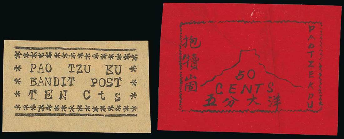 A collection on leaves which includes a section of the Municipal Posts with Shanghai Large Dragon 16ca. (printing 62), Chefoo 1c. on red band cover, Chungking 1894 2ca. imperf.x perf. strip of four, Wuhu 1895 ½c. Postage Due used on philatelic cover, Wei Hai Wei 1899 2c. unused; British Railways Administration 5c. on ½c. tied by Tientsin cancellation on local cover; some Foreign Post Offices including commercial Russian cover from Shanghai to Genoa, Taiwan 1894-95 Official stamp (S.G.C4); military stamps including 1922 Shangahi Light Horse 50c. unused, 1923 Pao Tzu Lu 'Bandit Stamps' with 5c. unused type 1a with original printing wrinkles) and 10c. unused type 1a; Liberated Areas including North China 1938 White Full Sun 1c., 1946 $8 on $12 yellow Large Vistory, Chin-Ki-Lu-Yu 1942 shaded bird on globe $2 yellow, Inner Mongolia $5 on $5000 light green, East China North Anhui 1949 $30 on $2 rose-red tête-bêche pair, Kiangsu Anhwei area "Xuazhung" on pigeon, Central China 1948 $2.50 yellow; Manchukuo locals plus some Imperial China including Large Dragon 3ca. used. An interesting collection. Photo