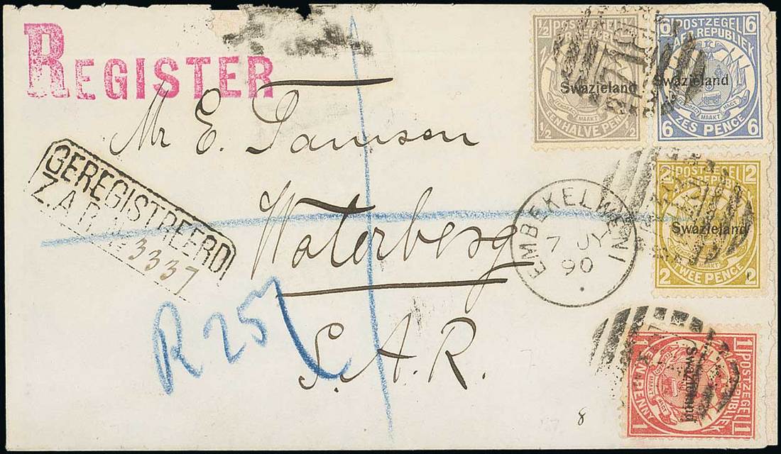 Small collection covering 13 issuing authorities, including very fine Swaziland 1890 (7 July) registered envelope to Waterberg bearing ½d. grey, 1d. carmine, 2d. olive-bistre, and 6d. blue Transvaal overprints, also British Bechuanaland surcharged postcard uprated with Jubilee Overprint ½d. vermilion, "Tati Concessions" 1/- red fine mint, and a small range of Palestine. Photo