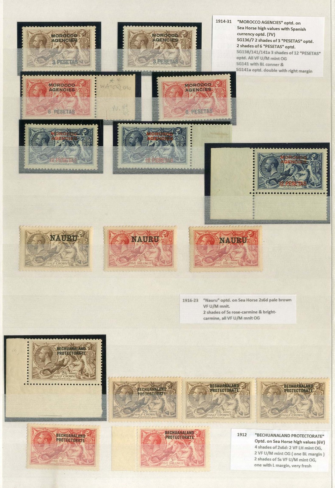 A selection of mint Seahorses with British Levant including 1921 45pi on 2/6d. to 180pi. on 10/- mint and overprinted "specimen", 1919-22 2/6d. (2); Morocco Agencies British currency 1914-31 2/6d. (2) and 5/- plus 1935-37 2/6d. (2) and 5/-, French currency values to 5f. on 5/- (3), Spanish currency with values to 12p. on 10/- (3, one a corner example); Bechuanaland with 1913-24 2/6d. (4) and 5/- (2); and Nauru 1915-23 2/6d. and 5/- (2). Generally lightly mounted or unmounted mint; a few with light gum toning, though these are generally confined to the lower values; with some margin and corner margin examples. (37)