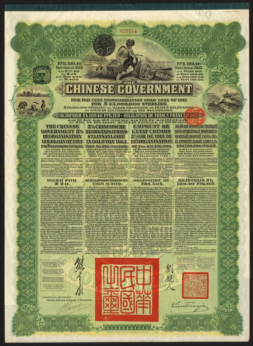1913 5% Reorganisation Gold Loan, bond for 189.40 roubles, issued by the Russo-Asiatic bank, #627714, 'Mercury' at top, vignettes at sides, green and black, with coupons. GVF.