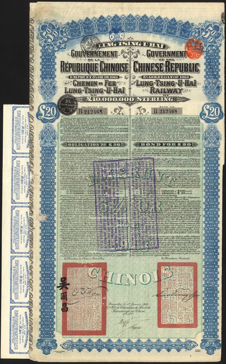 1913 Lung Tsing U Hai Railway 5% Gold Loan, bond for £20, #B212468, large format, ornate border, blue and black, text in English and French, with coupons. GVF.