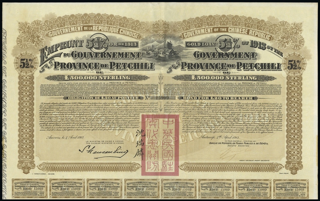 1913 5½% Gold Loan of the Province of Petchili, bond for £20, Antwerp, no.15909, text in French and English, very large format, red chop at bottom, ornate border, vignette at top of Chinese shipping scene, brown and black, with coupons, GVF.