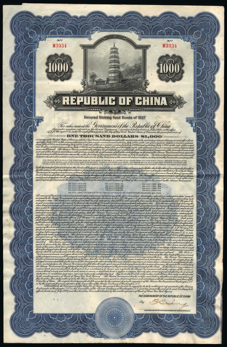1937 Secured Sinking Fund Bond (Pacific Development Loan), for US$1000, #M3934, pagoda at top, blue and black, with coupons, ABNCo. printing. A little crinkled, GVF.