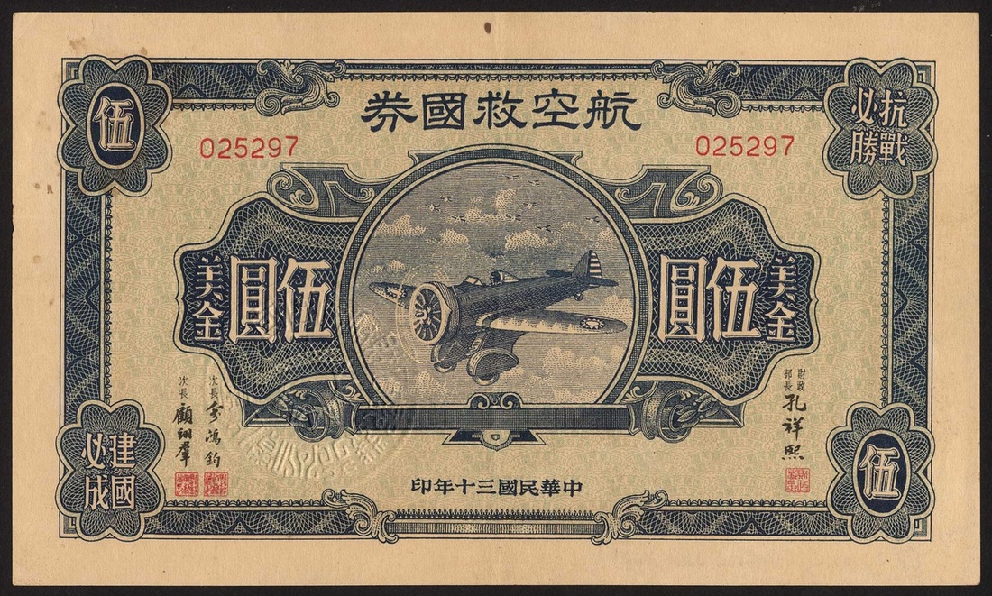 China: 1941 Air Force Salvation Loan, bond for $5, vignette of the Boeing P26 monoplane fighter, blue. A $5 million loan issued to modernise the Chinese Air Force. EF.