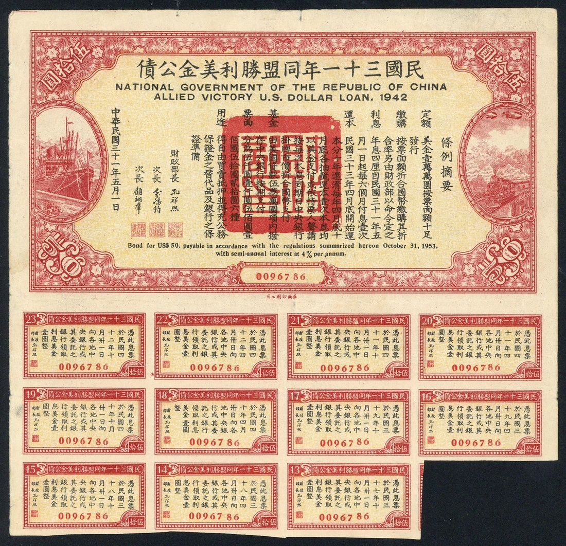 Allied Victory US Dollar Loan 1942, a group of 6 items comprising $20 blue (5) and $50 red (1), some with stains, but all VF (6)