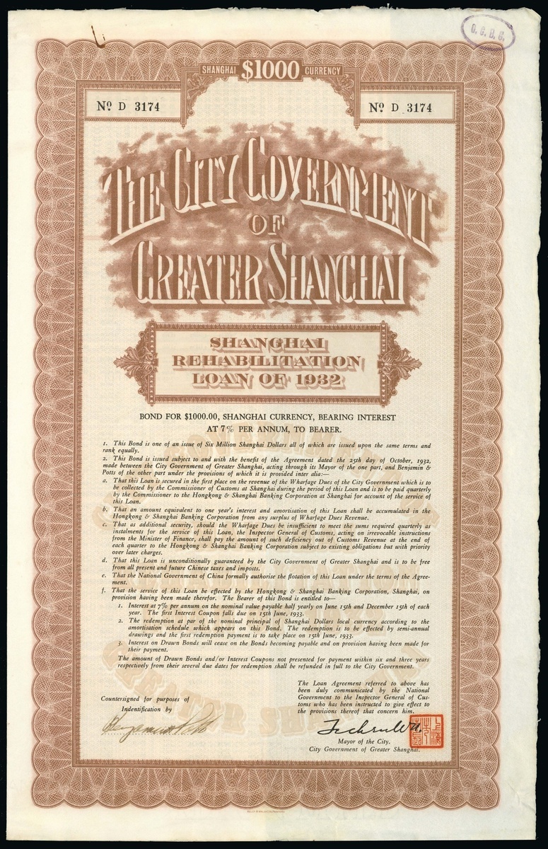 (x) City Government of Greater Shanghai, 7% Rehabilitation Loan of 1932, bond for $1000 Shanghai currency, #D3174, ornate border, brown and black, with coupons, printed by Kelly & Walsh Ltd., small rust mark at top edge otherwise AEF.