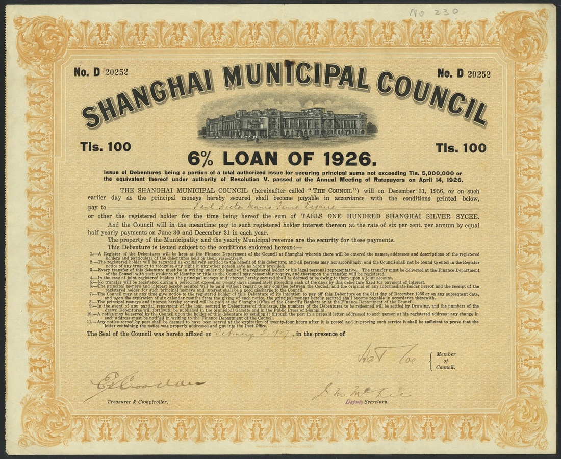 (x) Shanghai Municipal Council, 6% Loan of 1926, registered debenture for 100 taels, dated [1927], #D20252, vignette of government buildings at top, yellow and black, printed by waterlow & Sons, rust hole just above I in title, VF.