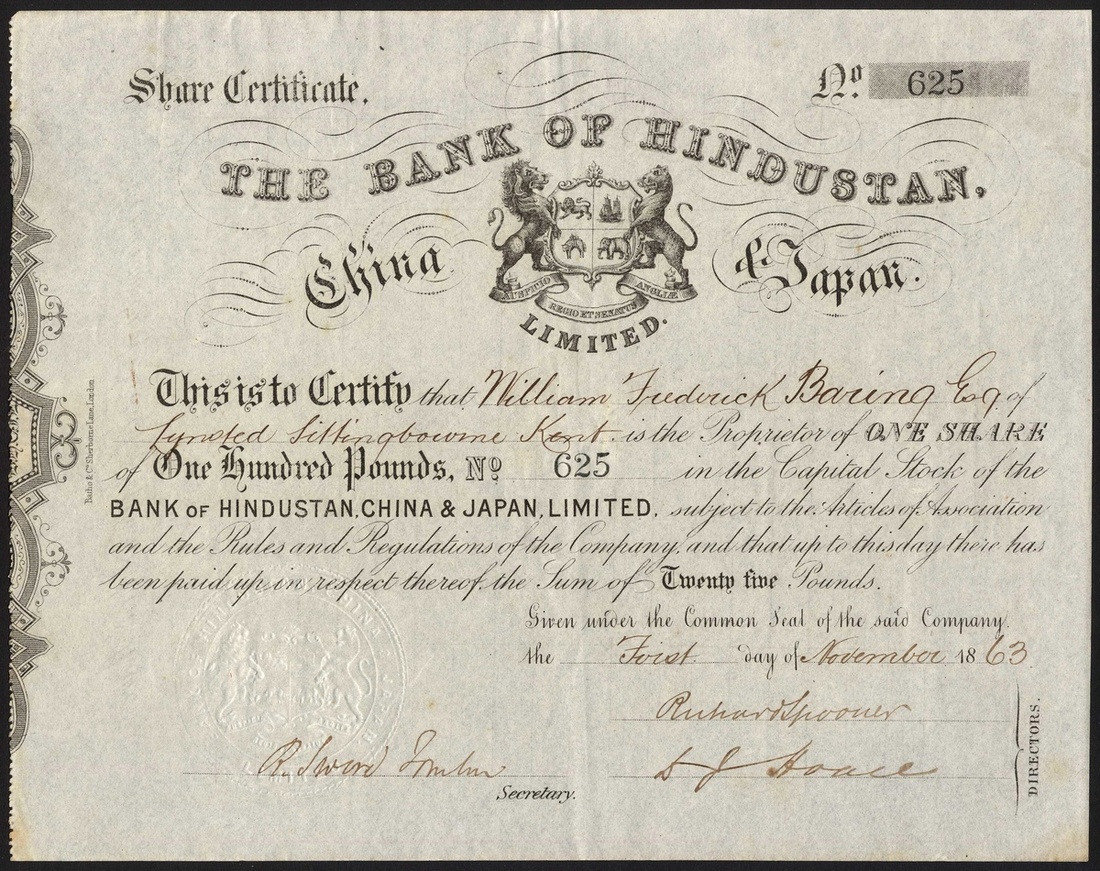 Bank of Hindustan, China & Japan Ltd., £100 share, 18[63], #625, issued to William Frederick Baring and signed by Deane J. Hoare as director, coat of arms at top, black. Failed and in liquidation during the 1866 crisis. AEF and scarce.