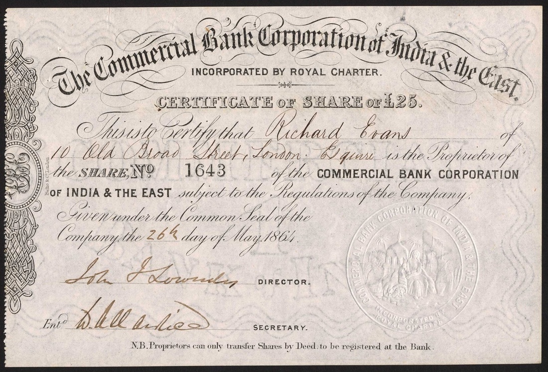 Commercial Bank Corporation of India & the East, £25 share, 1864, #1643, black printing on pink paper, attractive emnbossed seal. Incorporated by Royal Charter in 1864. Opened branches in China, Japan, Malaya and India. Failed in the wake of the Overend, Gurney crash of 1866. Prepared banknotes for issue (see Spink, lot 1701, January 2007). EF.