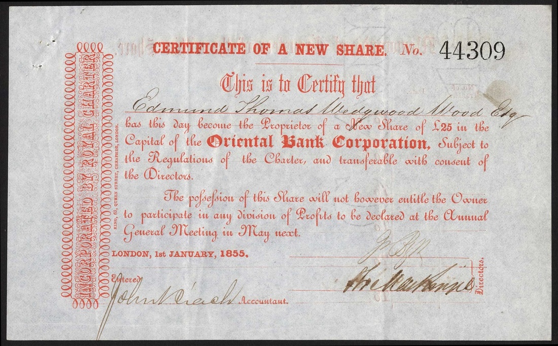 Oriental Bank Corporation, £25 NEW share, 1855, #44309, scrollwork at left, red. VF and considerably more scarce than the original issues of 1851.