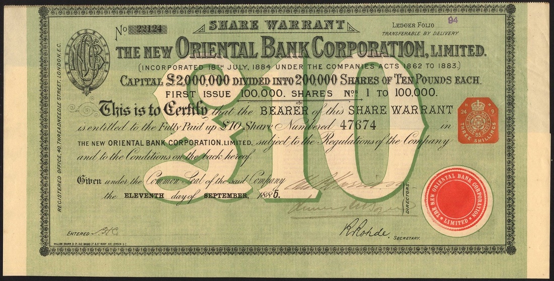 New Oriental Bank Corporation Ltd., bearer warrant for 1 share of £10, 188[5], green and black, red seal, with coupons. EF