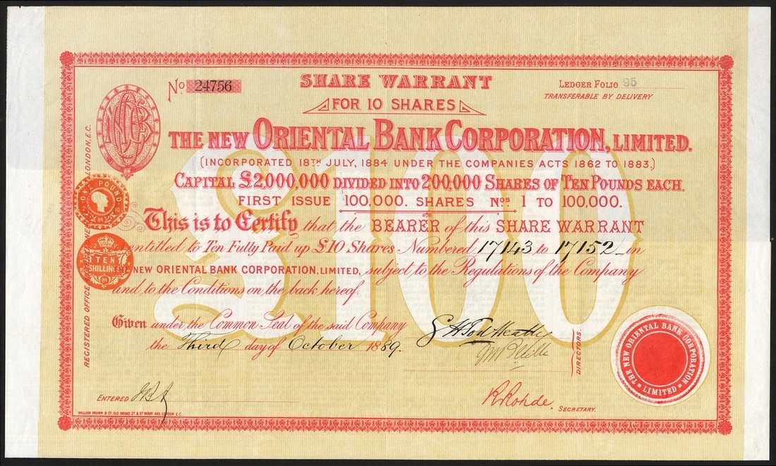 New Oriental Bank Corporation Ltd., bearer warrant for 10 shares of £10, 18[89], red and yellow, red seal, with coupons. GVF and very scarce denomination.