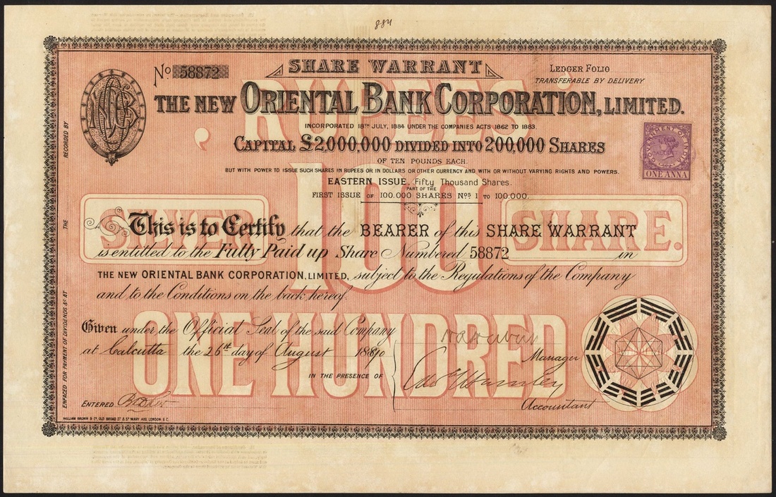 New Oriental Bank Corporation Ltd., Eastern Issue, bearer warrant for 1 share of 100 rupees, 188[90], pink and black, Indian adhesive revenue stamp. EF