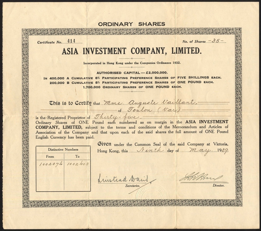 Asia Investment Co. Ltd., £1 ordinary shares, Hong Kong 19[39], #414, ornate border, black. VF and rare.