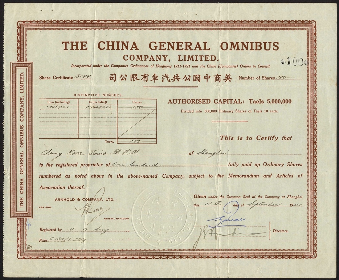 China General Omnibus Co. Ltd., 10 tael shares, 19[41], #8199, brown, text in English with title also in Chinese, embossed seal. Formed in the 1920's and operating motor buses in Shanghai, the company was operated mostly by English directors. Re-registered following WWII and later dissolved. AVF.