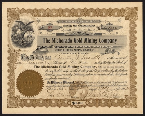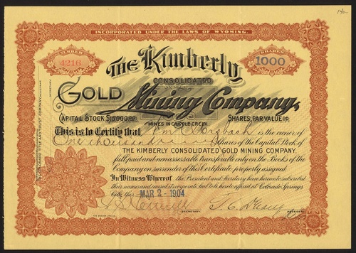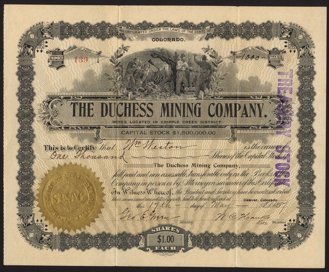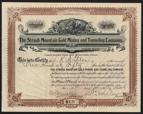 Cripple Creek: comprising Astor GMC, 1896; Bradford GMC, 1896; Columbia and Cripple Creek GMC, 1913; Cripple Creek Consolidated MC, 1896; Cripple Creek and North Cripple Creek Gold Mining and Milling Co., 1896; Duchess MC, 1897; Forest Rock GMC, 1896; Frisco and Cripple Creek GMC, 1896; Futurity Mining and Milling Co., 1902; Golden Eagle Mining and Milling Co., 1896; Humbolt Gold and Silver Mining and Milling Co., 1901; Ingham Consolidated GMC Ltd., 1896; Kimberley Consolidated GMC, 1904; Mariposa Mining and Tunnel Co., 1900; Michorado GMC, 1905; Millionaire GMC, 1896; New Haven GMC, 1896; O.H.P.B. Mining and Tunneling Co., 1896; Starr King GMC, 1898 and Straub Mountain Gold Mining and Tunneling Co., 1896. Generally VF, some scarce (20).