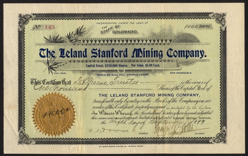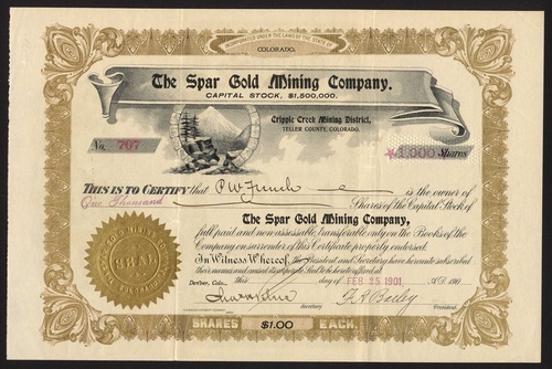 Cripple Creek: comprising Combination Mine and Tunnel Co., 1896; Commercial Men's Gold Mining and Milling Co., 1901; Cripple Creek Gold Rock MC, 1895; D.O.C. GMC, 1896; Des-Moines GMC, 189-; Gold Belt Consolidated MC, 1899; Guaranty Gold Mining and Investment Co., 1896; Horseshoe Consolidated MC, 1903; Kimberley Consolidated GMC, 1905; King GMC, 1900; Leland Stanford MC, 1899; Lucky 9 GMC, 1897; Mitchell Mining and Leasing Co., 1902; Pappoose GMC, 1895; Rochester and Cripple Creek GMC, 1896; Scranton GMC, 1896; Spar GMC, 1901; Squaw Mountain Tunnel Gold Mining and Drainage Co., 1896; Veteran GMC, 1896 and Zeus Gold Mining and Milling Co., 1896. Generally VF, several scarce (20).