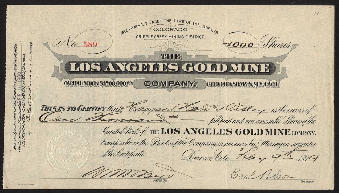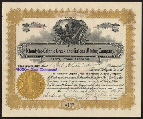 Cripple Creek: comprising Bonzai GMC, 1900; Cripple Creek Tunnel Transportation and MC, 1896; Empire GMC, 1896; Fair Mountain GMC, 1897; Golden Treasure Mining and Tunnel Co., 1899; Henrietta GMC, 1895; Inter-State GMC, 1897; King GMC, 1901; KLondyke-Cripple Creek and Galena MC, 1900; Los Angeles Gold Mine Co., 1899; National GMC, 1896; New York and Cripple Creek GMC, 1896; North Star GMC, 1896; Pan-American Gold Mines Co., 1896; Philadelphia and Cripple Creek Consolidated GMC, 1896; Progress GMC, 1902; Quartette GMC, 1900; Vermont GMC, 1896; Wabash Consolidated MC, 1902 and Woman's GMC, 1900. Generally VF, several scarce (20).