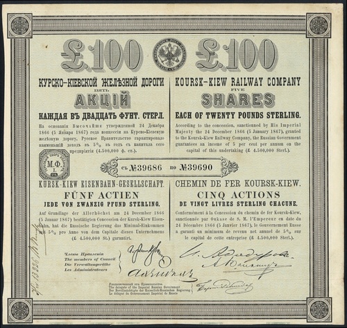 Russia: Koursk - Kiew Railway Company, certificate for 5 shares of £20, #39686-39690, arms at top, black, green underprint, in 4 languages, lacks coupons. GVF.