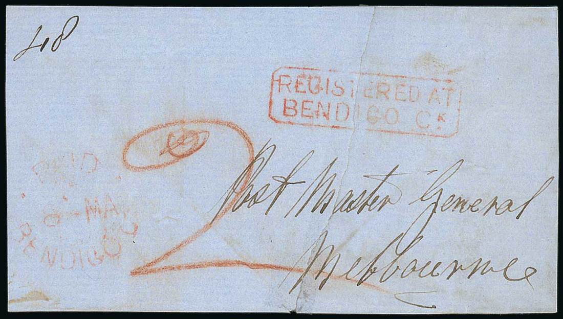 1853 (8 Mar.) front to Melbourne, rated "2" in red, showing framed "registered at/bendigo ck" (crossed by tear) and circular "paid/bendigo ck" datestamp, both in red. The only recorded examples of both markings with the former apparently used for only a short period at the beginning of 1853. Photo