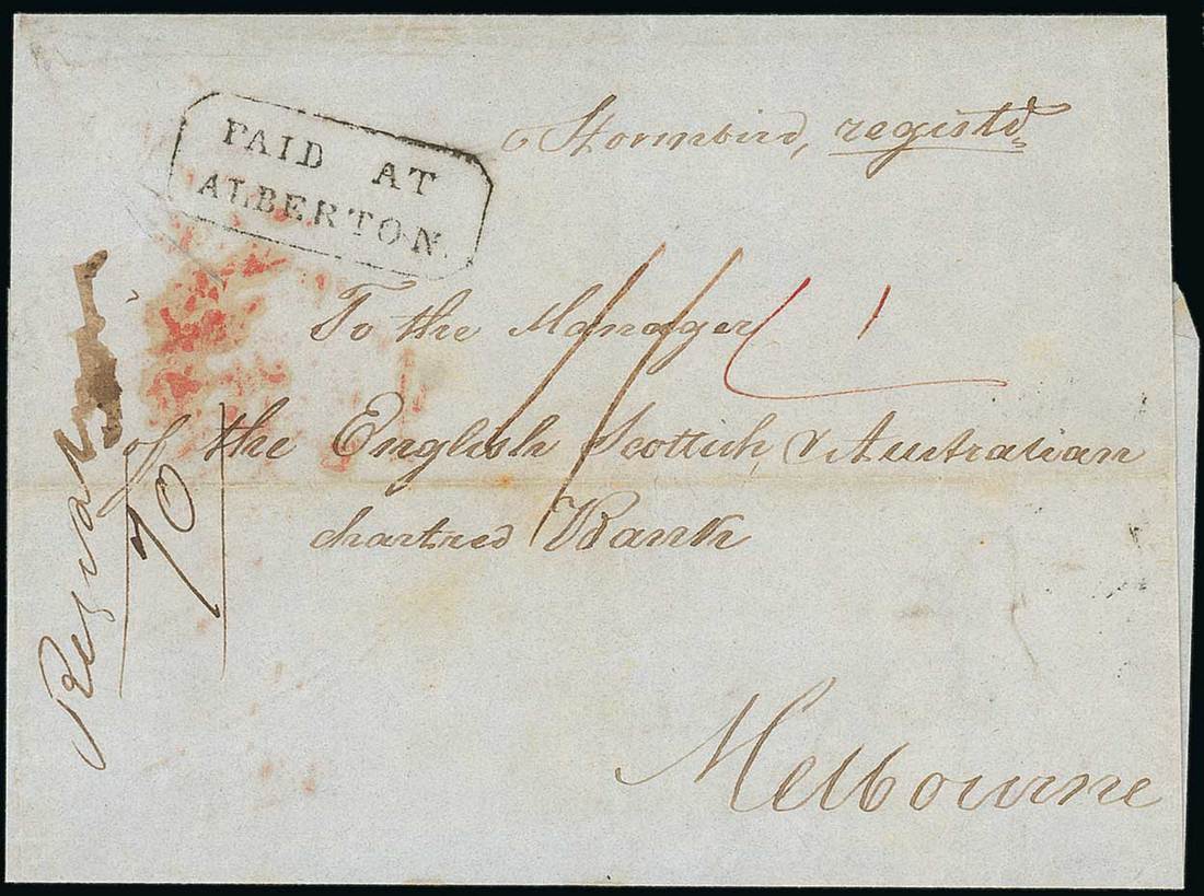 1855 (30 Aug.) unstamped entire from Alberton to Melbourne, marked "Registered", rated "1/4", showing fine framed "paid at/alberton" with, on reverse, despatch and "ship letter/free/g.p.o. victoria" c.d.s. (31.8) in red. Photo