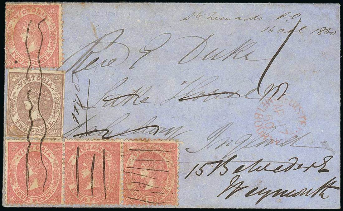 1860 (15 May) entire from Heathcote to Melbourne, bearing Octagonal perf 12 1/- and Beaded Oval 4d. cancelled by Barred Numeral "49", showing "registered/melbourne" c.d.s. in red and, on reverse, despatch datestamp. Clean and attractive. RPSV Certificate (2008). Photo