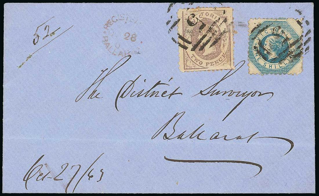1863 (28 Oct.) locally addressed Ballarat envelope, bearing Octagonal perf 12 /- and Emblem perf 12 2d. (defective), both clearly tied by Barred Numeral "5" and showing scarce "registered/ballarat" c.d.s. in red alongside. A scarce registered town letter. Photo