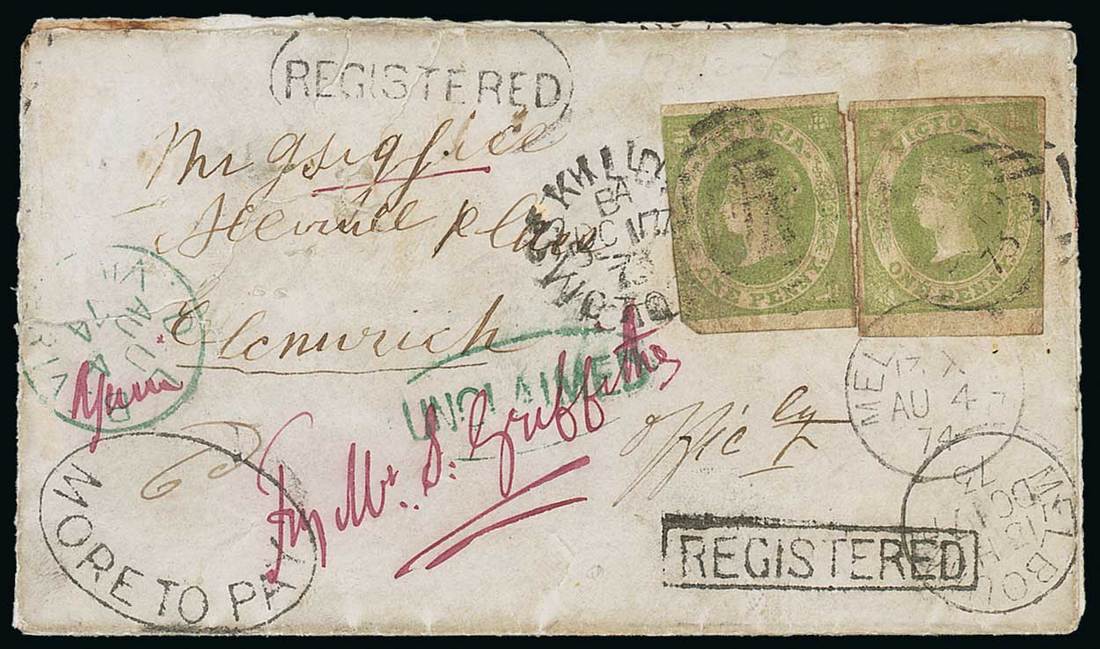 1873 (17 Dec.) envelope (opened-out for display) from St. Kilda to Elsternwick, bearing Emblem 1d. (2, both cut-into), showing framed and oval-framed "registered" h.s., Melbourne c.d.s. (17.12 and 4.8), oval-framed "more to pay", "d.l.r." c.d.s. (4.8) and oval-framed "unclaimed" in green with, on reverse, despatch and arrival (18.12) datestamps; the envelope and adhesives a little soiled. Photo