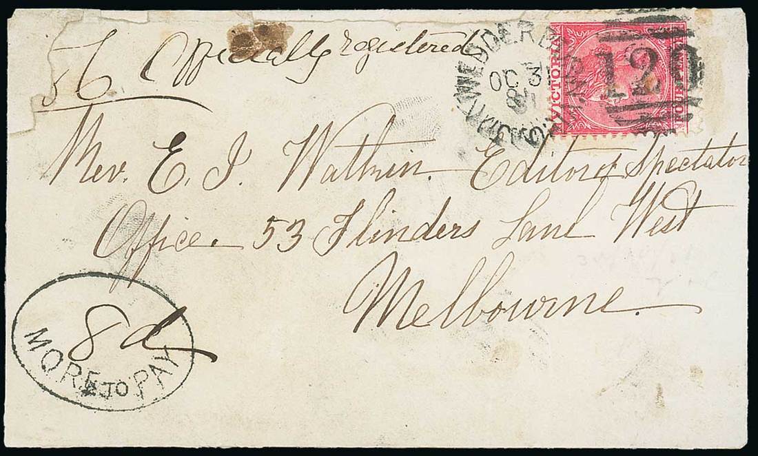 1881 (31 (Oct.) envelope to Melbourne, bearing Laureated 4d. tied by Wedderburn "120" duplex, marked "Officially Registered" and showing oval-framed "more to pay" with manuscript "8d" inserted; the envelope with flap missing. RPSV Certificate (2008). Photo
