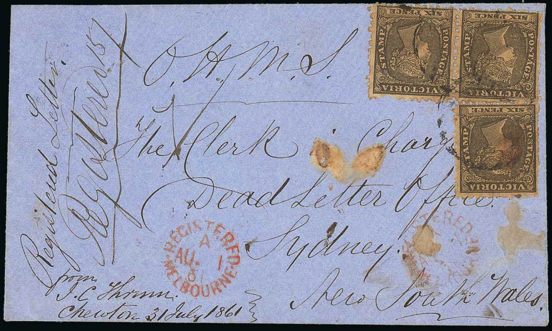 1861 (31 July) envelope from Chewton to Sydney, headed "O.H.M.S.", bearing Woodblock 6d. black pair and single cancelled by unclear barred numeral, showing "registered/melbourne" c.d.s. in red with, on reverse, despatch and "ship-letter/sydney" (6.8) datestamps; the face panel with small central stain. Photo