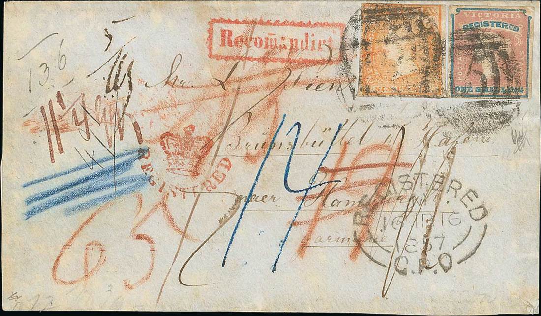 1856 (5 Dec.) envelope from Ballarat to Brunsbüttel, Schleswig-Holstein (now part of Germany), bearing Woodblock 6d and "registered" 1/- (both touched or just cut-into), both tied by slightly heavy Barred Numeral "5", showing various rate markings, "Crown/registered" h.s. in red, London Registered d.s. (16.3), framed "Recomandirt" in red and, on reverse, despatch, Melbourne, Aachen (17.3) and Royal Danish Postal Agency in Hamburg (18.3) datestamps. A rare destination and a most attractive franking. Photo