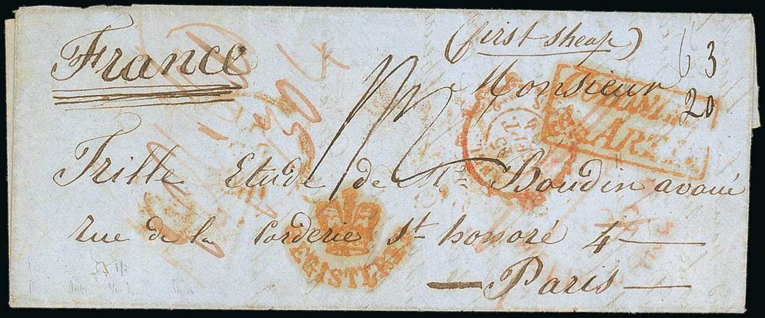 1854 entire letter in French to Paris, marked "Registered", showing "Crown/registered" h.s., scarce framed "colonies/&c. art. 13", Calais entry d.s. with London transit d.s. (14.9) on reverse, all in red; the entire with two small pieces missing on reverse. RPSV Certificate (1998). Photo