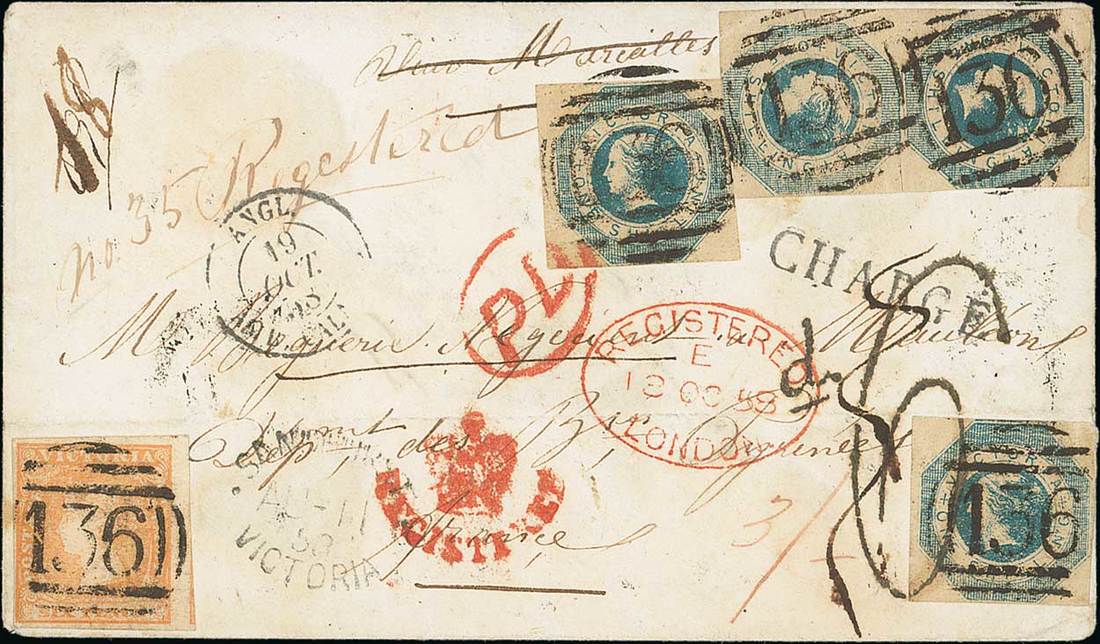 1858 (11 Aug.) envelope from Eaglehawk to France, bearing Woodblock 6d with Octagonal 1/- vertical pair and singles (2), all cancelled by crisp Barred Numeral "136", showing Sandhurst transit d.s. (11.8), oval-framed "pd", "Crown/registered" h.s. and Registered London oval d.s. (18.10), all in red, handstruck "d6", Calais entry d.s., "charge" h.s. and, on reverse, despatch, Melbourne and French transit datestamps; the envelope with four wax seals cut away on reverse. A spectacular and rare franking from a small post office. Photo