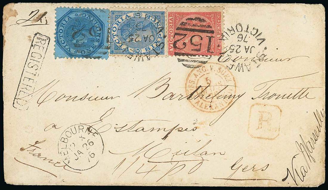 1876 (25 Jan.) double rate envelope from Stawell to Gers, marked "Via Marseilles", bearing Laureated 4d., 6d. and 1/-, all clearly tied by "152" duplex, showing Melbourne c.d.s., framed "registered", boxed "r." in red, "poss. ang. v. suez/alexandrie" c.d.s. with French transit datestamps on reverse. Attractive. Photo