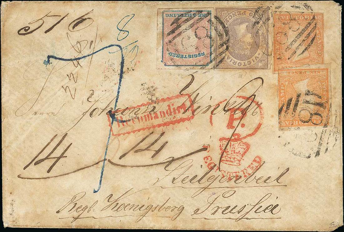 1857 (22 Dec.) envelope from Amherst to Heilgenbeil, bearing "registered" 1/-, Woodblock 6d. (2) and Emblem 2d., all tied by Barred Numeral "68", showing various manuscript rate marks, "Crown/registered", oval-framed "p." and framed "Recommandirt", all in red, with despatch, Melbourne, London and Aachen datestamps on reverse; the envelope a little soiled and stained, nevertheless a rare franking and one of three covers known to Prussia bearing the Registered stamp. Photo