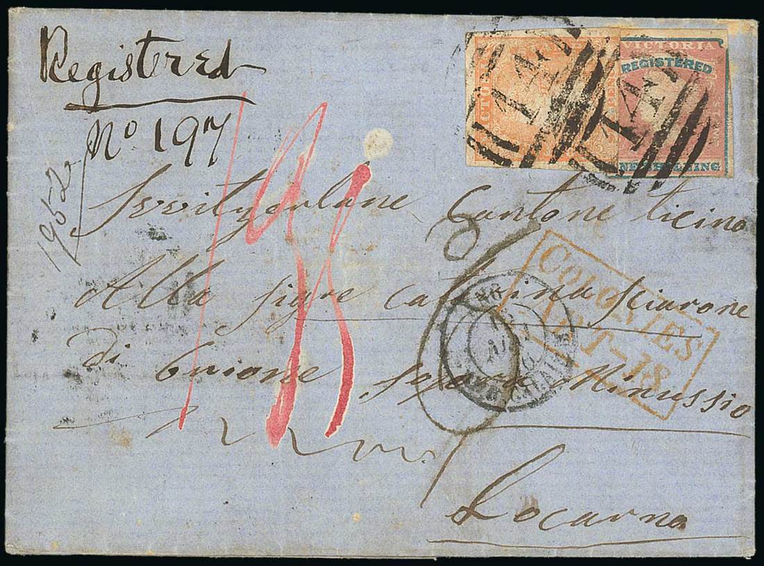 1856 (20 Feb.) entire letter from Avoca to Locarno, bearing "registered" 1/- Die II and Woodblock 6d., both tied by Barred Numeral "14", showing handstruck "d6", framed "colonies/art - 18" in red and manuscript "95" (decimes) and, on reverse, despatch, Melbourne, Australian Packet Liverpool (13.5), London, Basel and arrival datestamps; the odd minor age spot. Photo