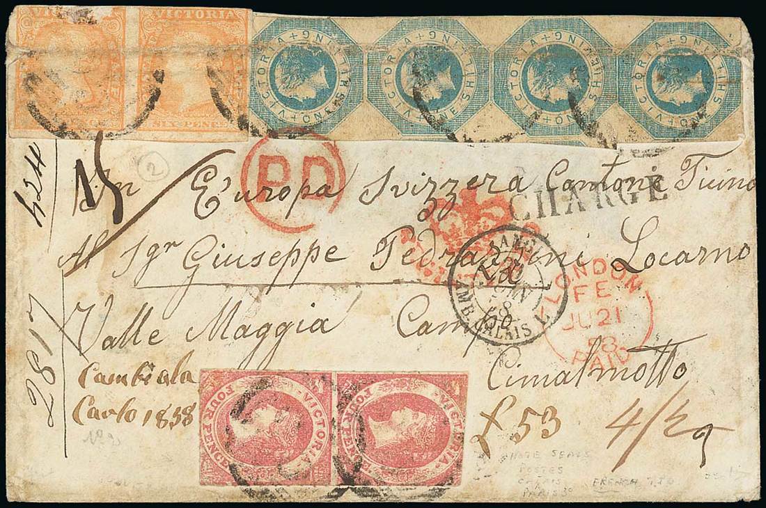 1858 (29 Mar.) envelope from Hepburn to Locarno, bearing Woodblock 6d. pair, Octagonal 1/- vertical strip of four and Emblem 4d. vertical pair (the first two affixed over top edge of envelope), cancelled by poor Barred Numeral "25", showing manuscript "4/2", "Crown/registered", circular-framed "pd" and London Paid transit c.d.s. (21.6), all in red, Calais entry c.d.s., "charge" h.s. and, on reverse, despatch, Melbourne and arrival datestamps; a little soiled, the envelope with top flap missing and the stamps mostly defective. A rare mixed-issue franking. Photo