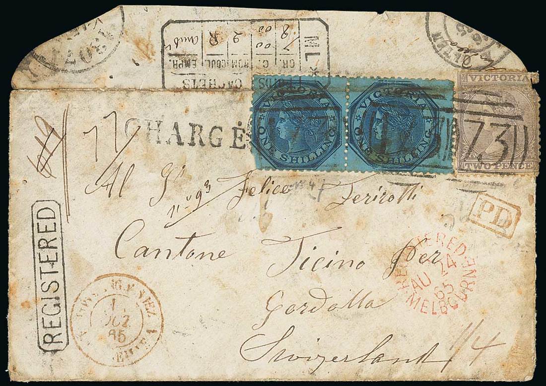 1865 (23 Aug.) envelope from Daylesford to Ticino, bearing Laureated 2d. (defective) and 1/- pair, both clearly cancelled by Barred Numeral "173", showing framed "registered", "registered/melbourne" c.d.s., boxed "pd" and Marseilles" entry d.s. in red, "charge" h.s. and, on reverse, despatch d.s. with various French and Swiss transit datestamps; the adhesives affixed over top edge and the envelope with part flap missing and a little soiled/stained. Photo