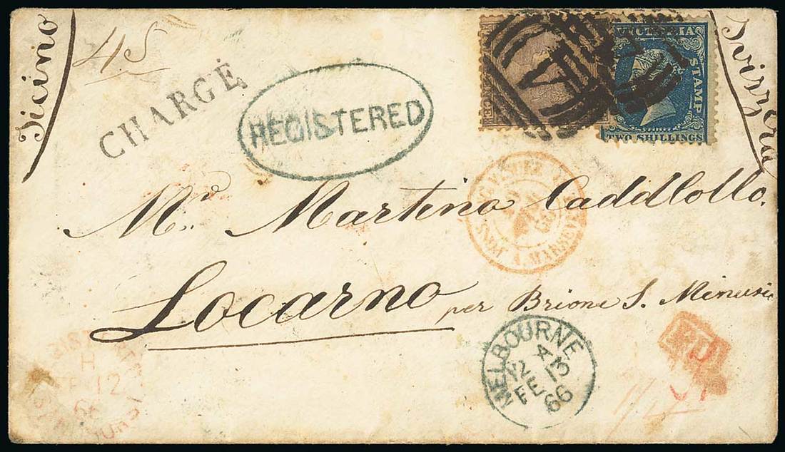 1866 (12 Feb.) envelope from Sandhurst to Locarno, bearing Woodblock 2/- and Laureated 2d., both cancelled by Barred Numeral "4", showing oval-framed "registered" and Melbourne c.d.s. in blue-green, boxed "pd" and Marseilles entry d.s. in red, "charge" h.s. and, on reverse, various French and Swiss transit datestamps; the envelope slightly soiled. Photo