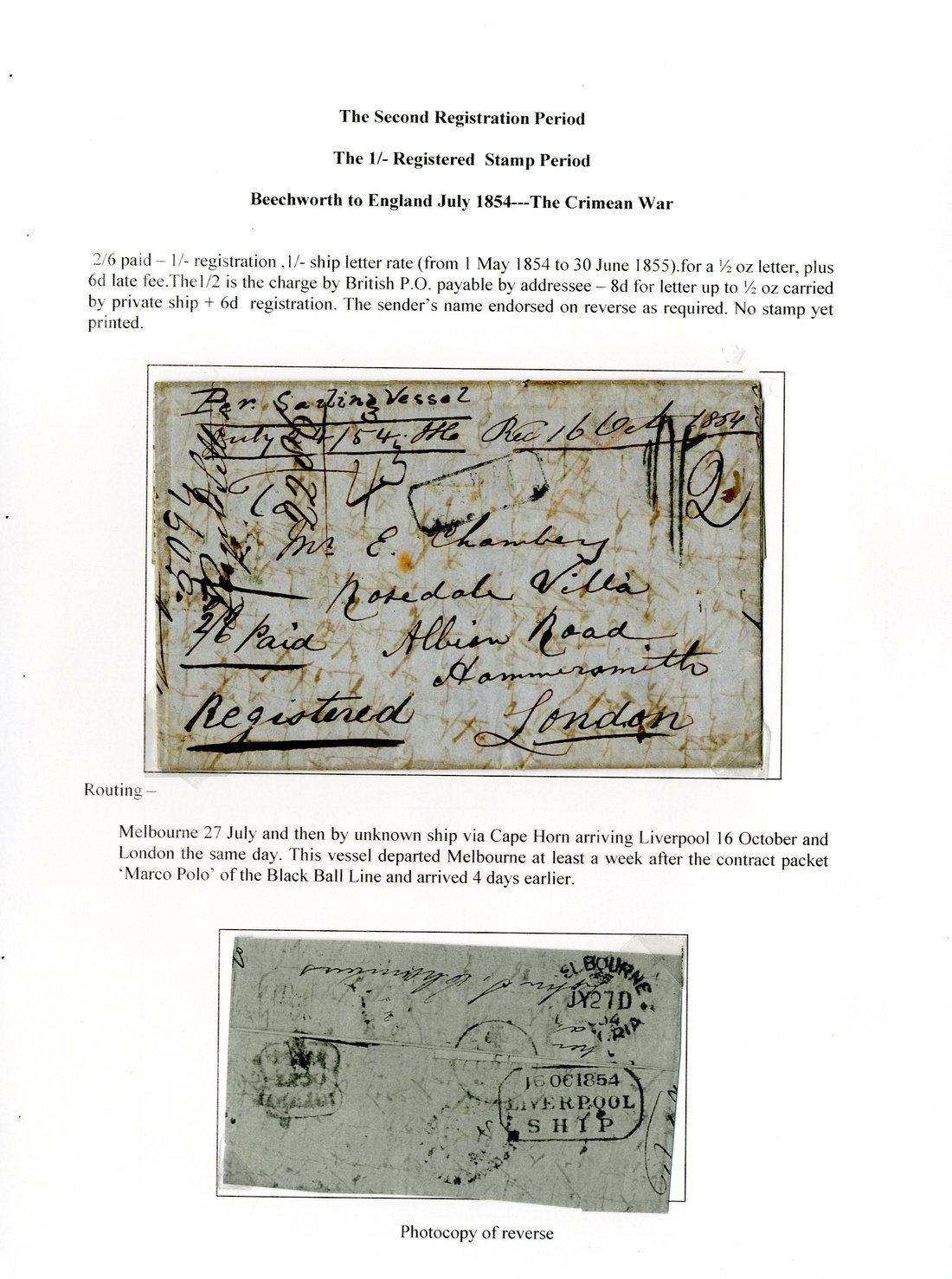1854 (24 July) entire letter to London, marked "Registered" and "2/6 paid", showing manuscript "2" with handstruck "1/-" in front, poor framed "paid at/beechworth" h.s. in black and, on reverse, Melbourne, green "liverpool/ship" (16.10) and red arrival (16.10) datestamps