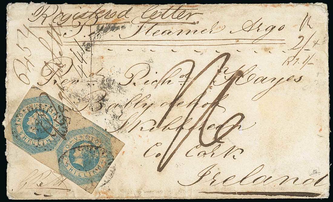 1855 (1 Jan. ) double rate envelope from Beechworth to Ireland, marked "Per Steamer Argo" and "Registered Letter", rated "2/-" and "1/6", bearing Octagonal 1/- pair (small faults) tied by unclear barred oval and manuscript "Registered" and showing, on reverse, Melbourne, London (18.3) and arrival datestamps. A scarce retaliatory rate cover. Photo