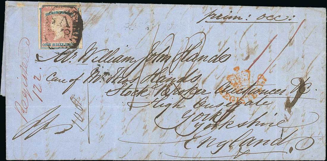 1855 (30 Apr.) entire letter from Mount Franklyn, Spring Creek to England, rated "1/-" in red and "1/2", bearing "registered" 1/- rose and blue (fault at top due to filing crease) tied by Barred Oval "82", showing "Crown/registered" h.s. in red and, on reverse, "hepburn/victoria", London (6.8) and arrival datestamps; some light filing creases. A rare franking being one of six known with the "Registered" stamp alone. RPSV Certificate (2008). Photo