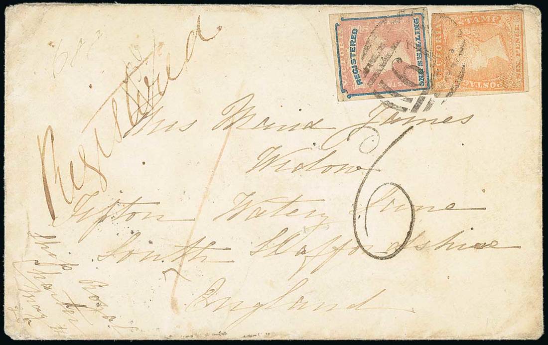 1856 (9 May) envelope from Maryborough to Staffordshire, bearing Woodblock 6d. and "registered" 1/- Die I, both clearly tied by Barred Numeral "61", showing handstruck "d6" and, on reverse, despatch, Melbourne and various transit and arrival datestamps. A neat and attractive franking. RPSV Certificate (2008). Photo