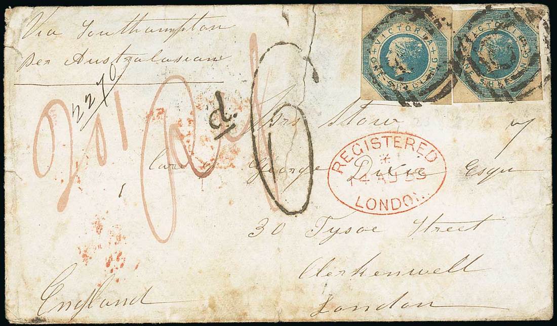 1858 (June) double rate envelope from Ballarat to London, marked "Via Southampton per Australasian", bearing Octagonal 1/- (2, both a little soiled), showing handstruck "d6" and red Registered arrival d.s. (14.) with, on reverse, Melbourne transit d.s.; the envelope a little soiled, top flap missing and with large central vertical repaired tear through face panel. Photo