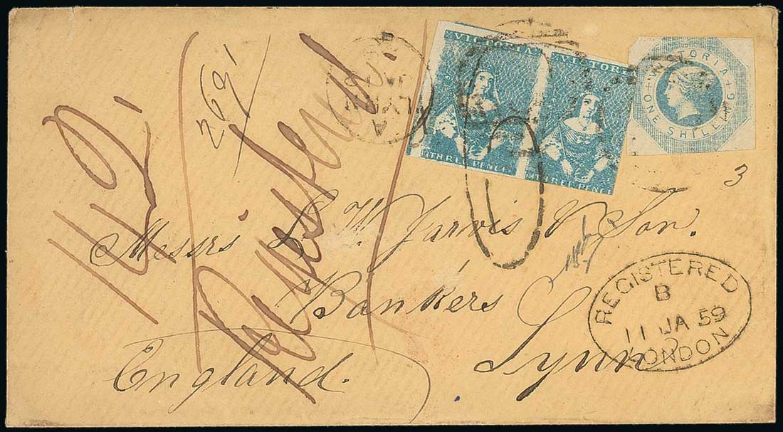 1858 (23 Oct.) envelope to Lynn, marked "Registered", bearing Half-Length 3d. pair (right stamp cut-into) and Octagonal 1/-, both cancelled with indistinct barred numeral, showing London Registered d.s. (11.1), handstruck "d6" and arrival d.s. (the last two tying the pair) with Melbourne d.s. on reverse. Photo