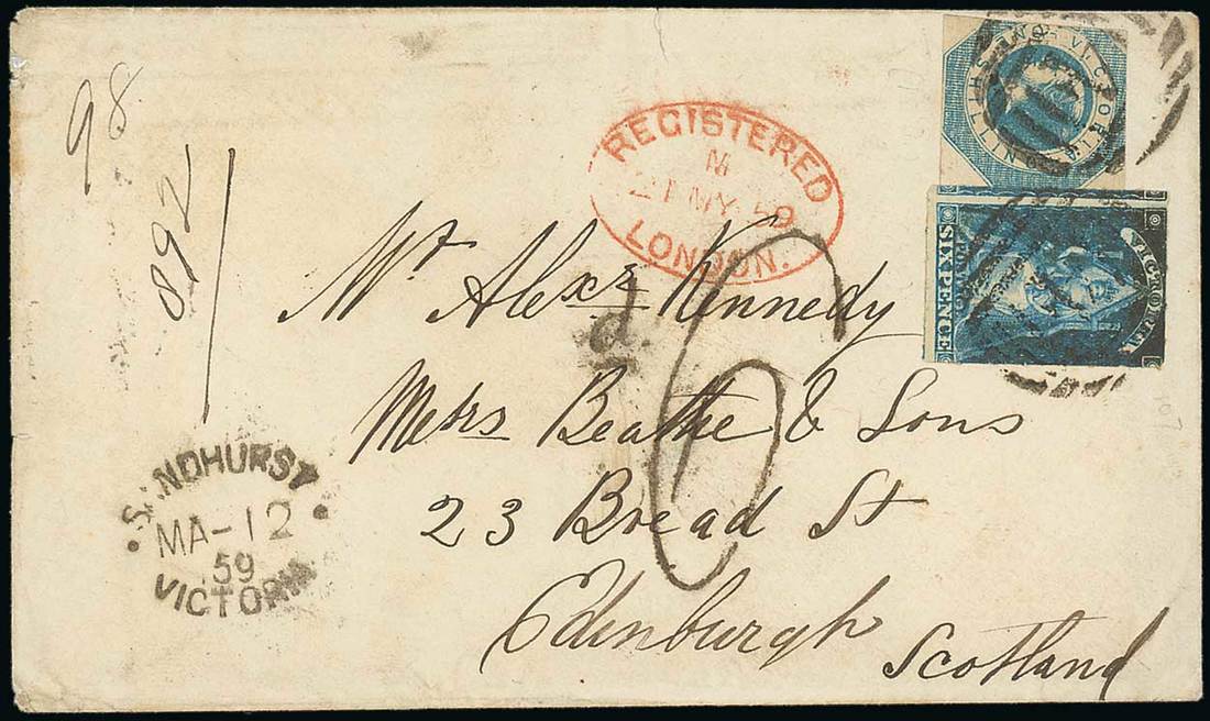 1859 (12 Mar.) envelope from Sandhurst to Edinburgh, bearing Octagonal 1/- (cut-into) and Queen on Throne rouletted 6d., both tied by Barred Numeral "4", showing despatch d.s., red Registered London d.s. (21.5) and handstruck "d6" with, on reverse, Melbourne and arrival datestamps. Photo