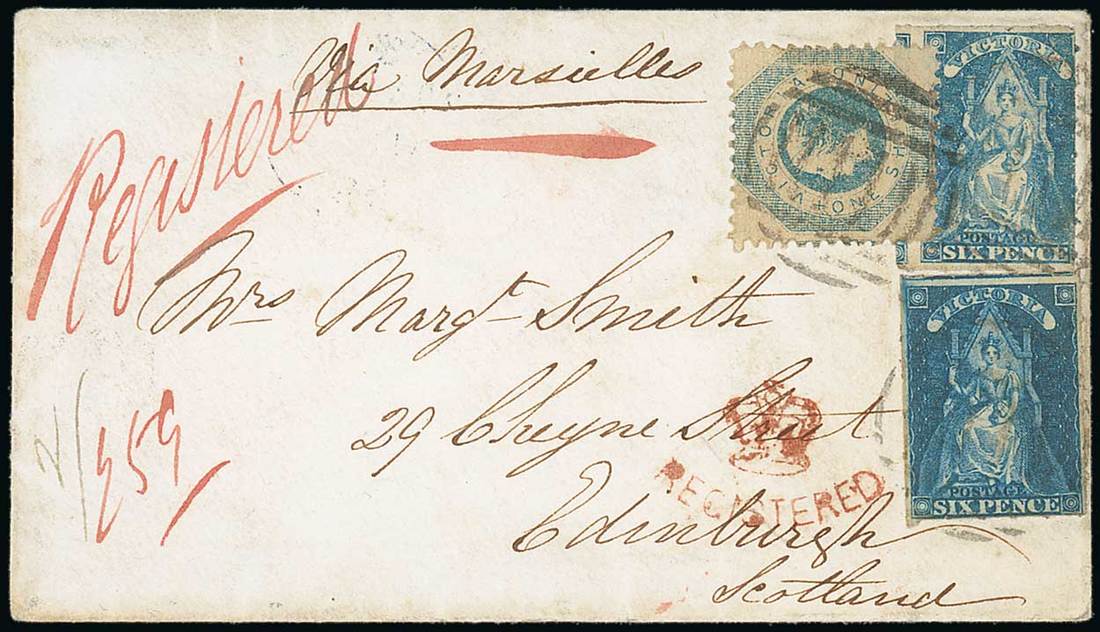 1859 (17 June) envelope from Williamstown to Edinburgh, marked "Via Marseilles", bearing Octagonal perf 12 1/- and Queen on Throne rouletted 6d. (2), all lightly tied, showing "Crown/registered" h.s. in red and, on reverse, despatch and arrival (6.8) datestamps. RPSV Certificate (2008). Photo