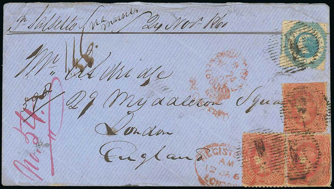 1860 (24 Nov.) envelope from Melbourne to London, marked "pr Salsette via Marseilles", bearing Octagonal perf 12 1/- and Beaded Oval 4d. pair and single (both with perf. faults), all tied by "1" in bars, showing "registered/melbourne" c.d.s. and arrival Registered d.s. (12.1), both in red. An attractive franking. Photo